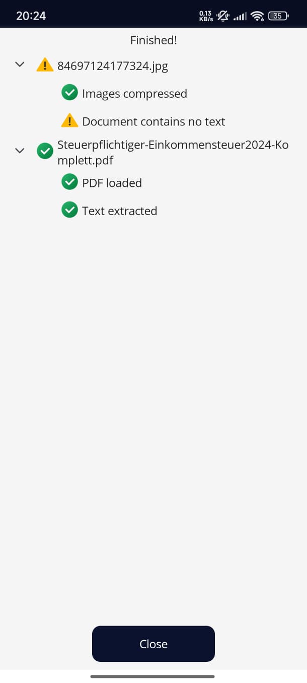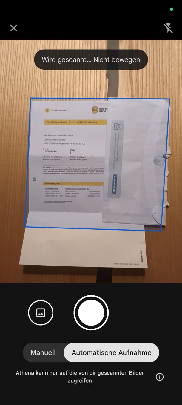 With Athena, you can create documents based on multiple sources, such as images and PDFs. The resulting document is stored as a PDF locally on your device. When creating a document, you can opt-in to extract text, which can later be used in the “Search” tab for a full-text-search over all available documents.