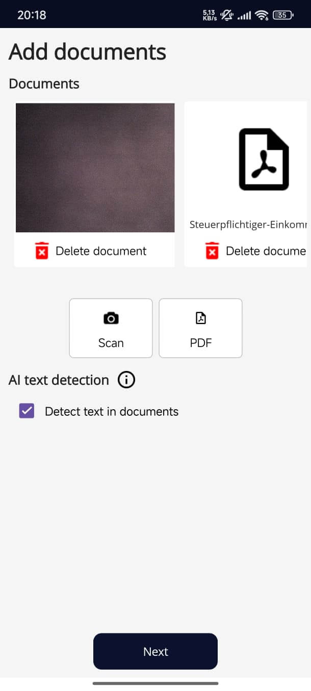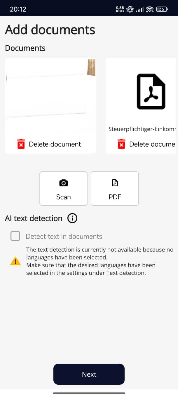 Scanned documents and PDFs are displayed under documents. You can use the Delete document button to remove the related document from the selection.